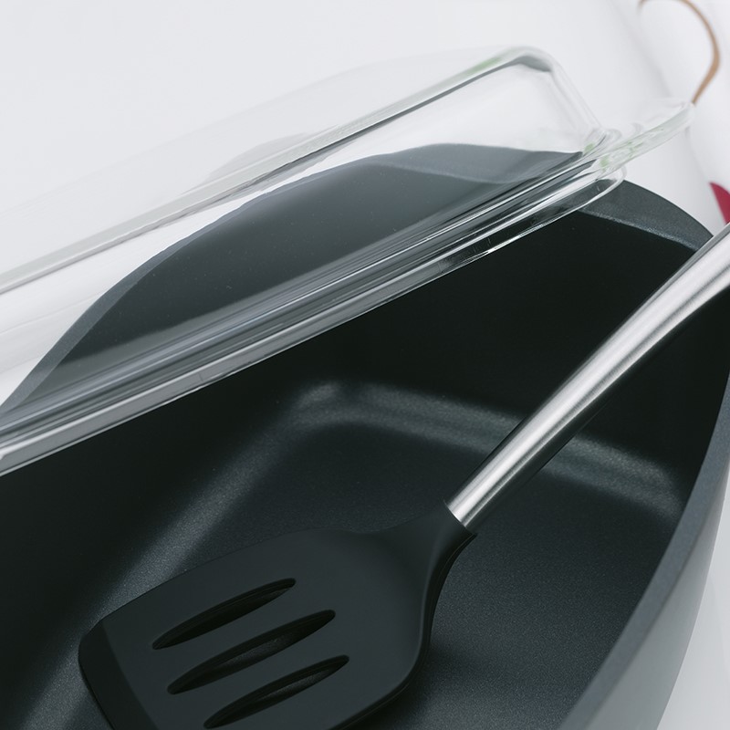 Massive baking pan made of high-quality cast aluminum with a ground bottom with a thickness of 5 mm, cooking glass lid, equipped with high-quality non-stick ceramic surface GREBLON C3 +, suitable for gas, electric, ceramic and induction cookers, dishwasher safe - but we recommend washing by hand, so to prolong the life of the non-stick surface, do not use metal tools when working. Bottom size for contact with the plate 24.5 x 13 cm.